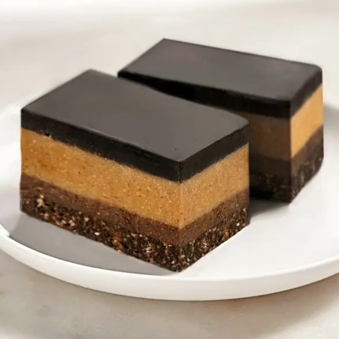 Four indulgent layers of chocolate nougat, rich caramel and our signature raw chocolate atop a mouth watering chocolate nut crumble base