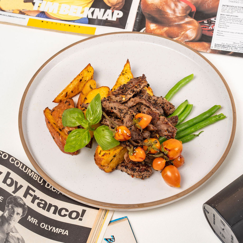 150g Of Juicy steak crusted in cracked pepper and grilled for maximum flavour. Paired with golden paprika wedges and fresh greens. High-protein, big flavour, Crowd Pleaser. Want more protein? Just click extra protein to get a total of 200g of cooked steak!